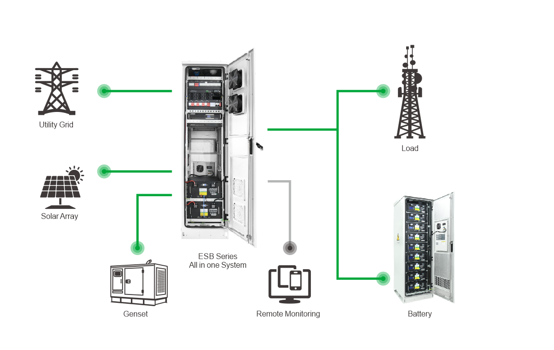 I nostri nuovi sistemi di raddrizzatori per telecomunicazioni della serie ESB sono progettati secondo il concetto di "sistema di alimentazione multifunzionale integrato per stazione base". Include il modulo raddrizzatore, il modulo MPPT solare, l'inverter, la batteria al litio, il modulo di monitoraggio, il condizionatore d'aria, la PDU (unità di distribuzione dell'alimentazione) e l'armadio della stazione base in un'unica piattaforma, offrendo una soluzione infrastrutturale completa per la costruzione di sistemi di stazioni base. Proprio come in questo progetto, possiamo personalizzare tutti i tipi di sistemi di raddrizzatori per telecomunicazioni della serie ESB in base alle esigenze del cliente, rendendoli più flessibili, affidabili e convenienti.