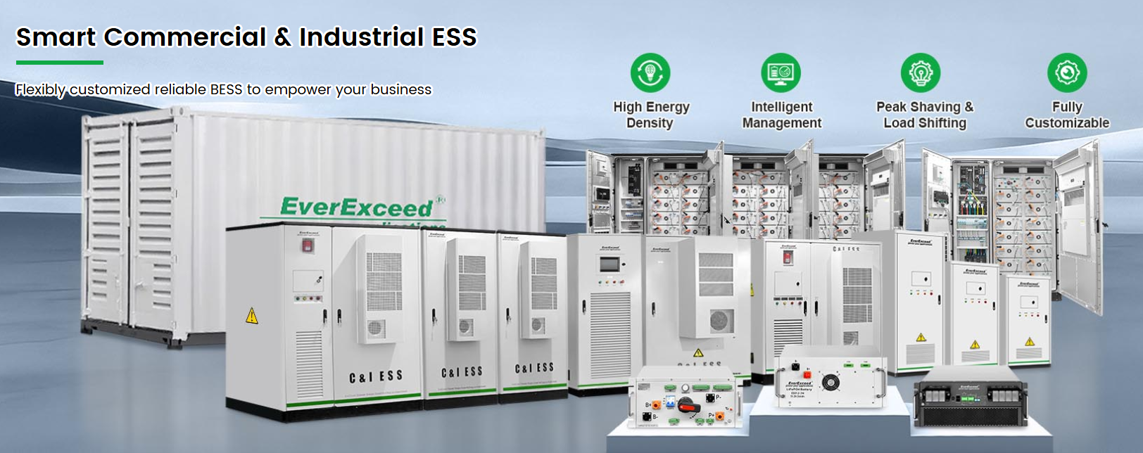 Come globale produttore di sistemi di accumulo di energia con oltre 20 anni di esperienza in produzione di batterie e integrazione di sistema, EverExceed fornisce sistemi di accumulo di energia commerciale e industriale (C&I ESS) affidabili, efficienti e scalabili per aiutare le aziende a ottimizzare i costi dell'elettricità, migliorare l'affidabilità dell'energia e accelerare la transizione energetica.