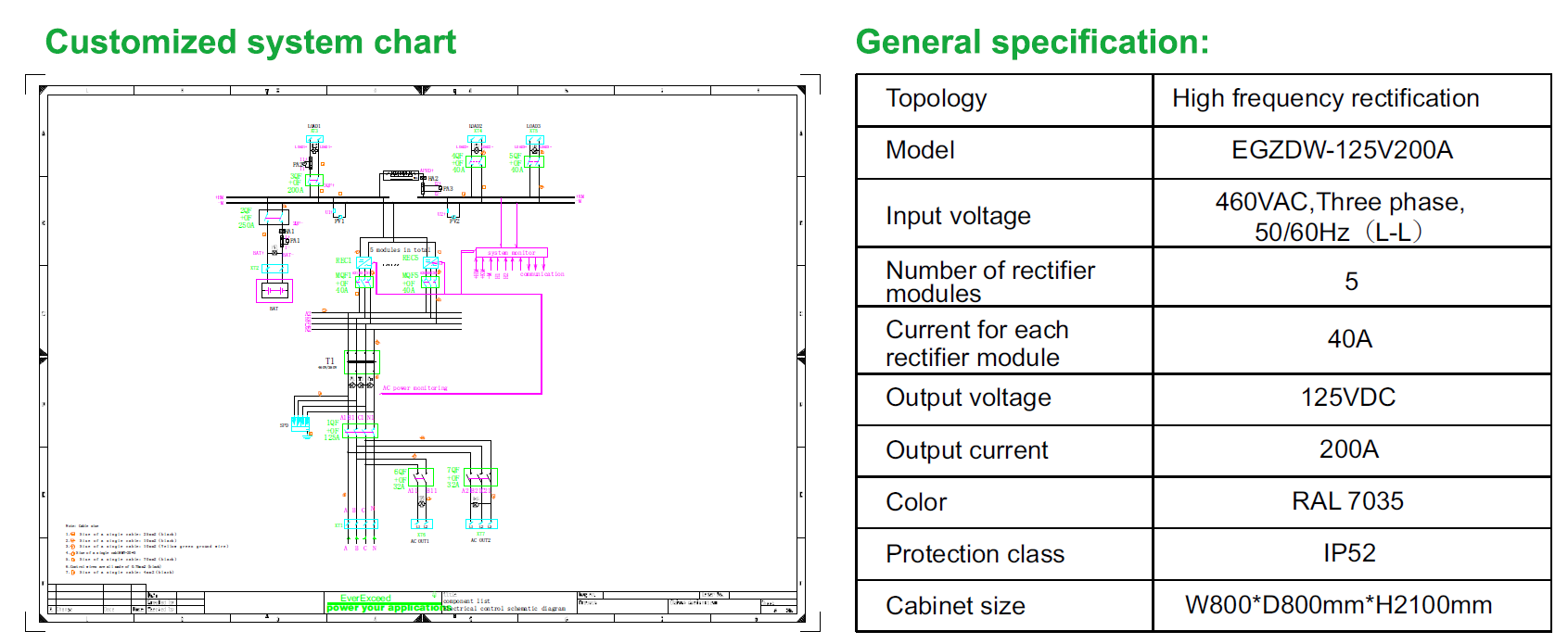 EverExceed ha personalizzato il caricabatterie CC modulare raddrizzato ad alta frequenza da 125 V CC e 200 A in base alle esigenze del cliente. Il sistema operativo adotta principalmente cinque moduli raddrizzatori ad alta frequenza ed è dotato di modulo di monitoraggio e protezione da sovratensioni da fulmini; il carico di uscita è dotato di una catena buck al silicio personalizzata (buck max 35 V, 50 A). Inoltre, l'armadio LP52 dispone di funzioni come la compensazione della temperatura, il test di scarica della batteria e la protezione da guasti a terra. Questo caricabatterie CC personalizzato offre migliori funzioni di monitoraggio e protezione, non solo soddisfa il fabbisogno energetico delle apparecchiature speciali nella sottostazione, ma monitora anche lo stato di funzionamento, notifica tempestivamente al personale di servizio eventuali avvisi di guasto e garantisce il normale funzionamento delle apparecchiature nella sottostazione.