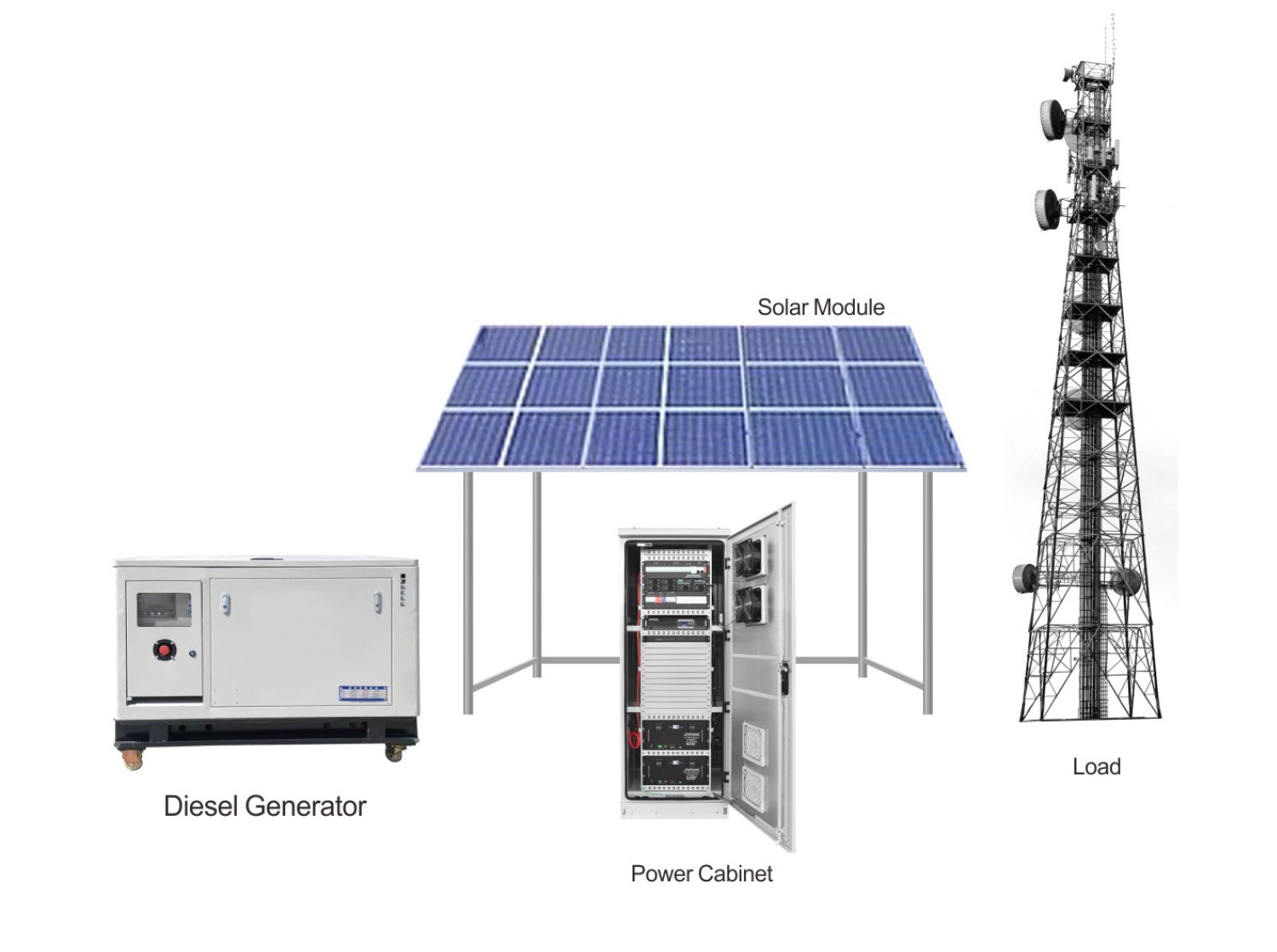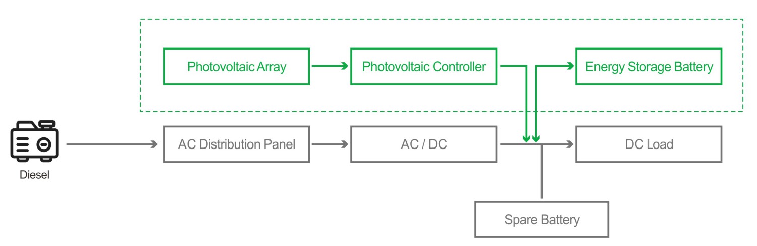 Questa architettura ibrida (fotovoltaico + batteria + diesel) garantisce un'alimentazione della stazione base pulita, stabile e conveniente.